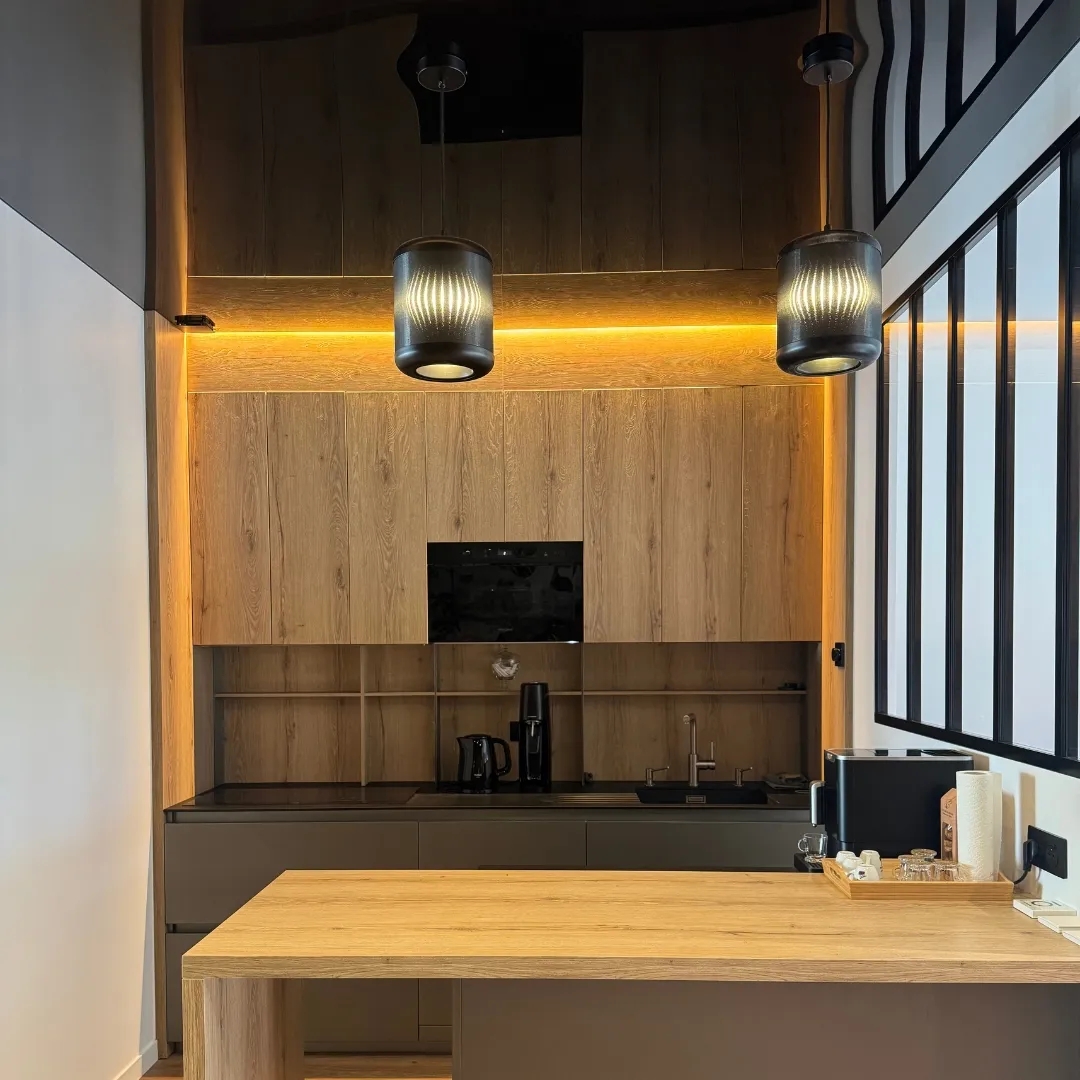 Il permet aussi d’intégrer spots, LED ou éclairage diffus pour une ambiance lumineuse agréable.